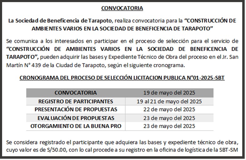 La sociedad de Beneficencia de Tarapoto, realiza convocatoria para la "CONSTRUCCIÓN DE AMBIENTES VARIOS EN LA SOCIEDAD DE BENEFICENCIA DE TARAPOTO"Se comunica a los interesados en participar en el
